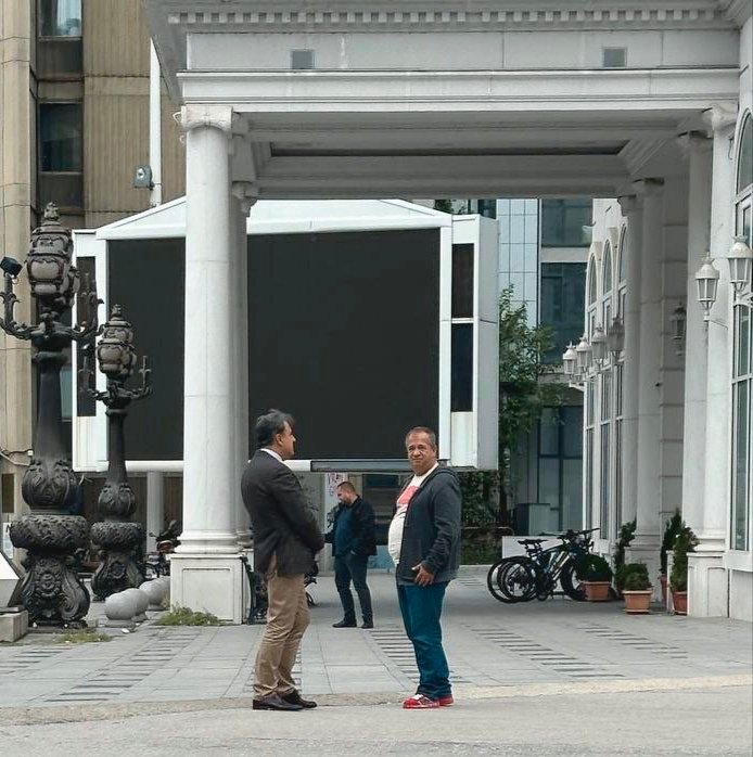 „ФАТЕНИ НА ДЕЛО. Подлизуркото на Мицика – вечниот директор на ‘независната’ Агенција за аудио и аудиовизуелни медиумски услуги Зоран Трајчевски сликан пред Белата Палата (седиштето на ВМРО-ДПМНЕ) со вмровскиот PR стратег Бичиклиски“