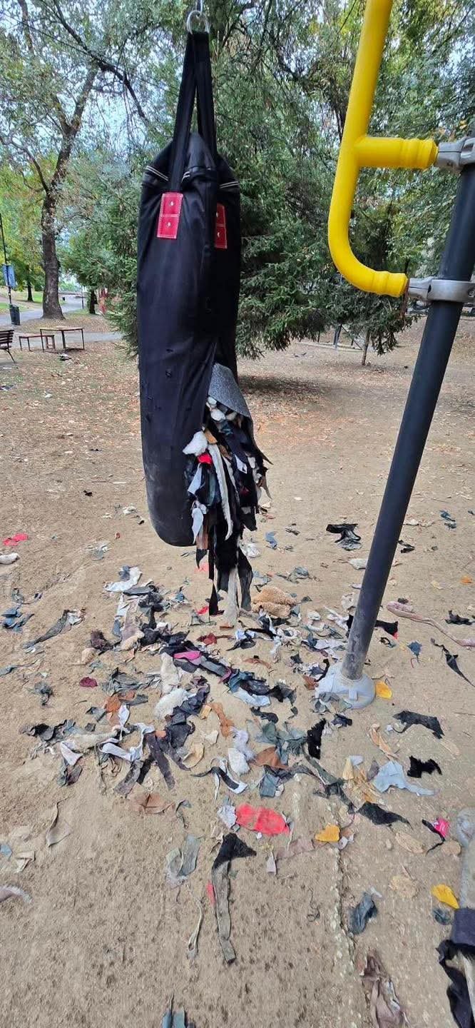 - Вреќата за бокс е исечена со нож и целосно уништена.