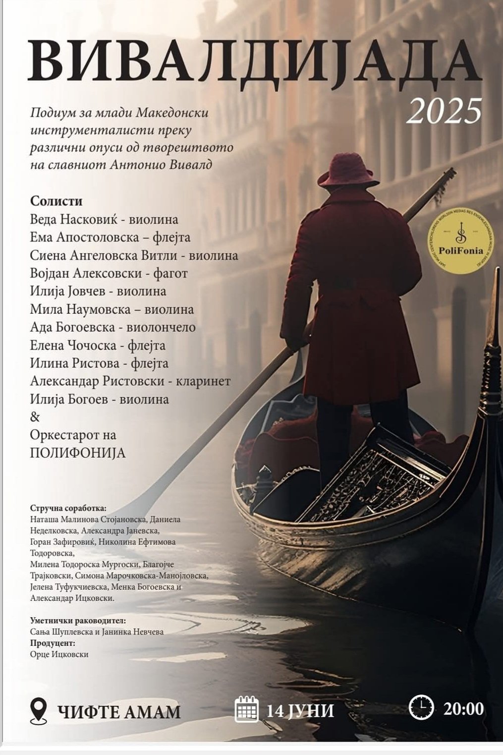 Овој уникатен настан, кој се одржува со слободен влез за сите посетители, претставува вистинска музичка екстраваганца наменета за афирмација на млади македонски инструменталисти. Публиката ќе има ретка можност да ужива во внимателно избрана програма што го слави виртуозниот стил на Антонио Вивалди – композитор чие дело и денес плени со енергија, емоција и креативност.