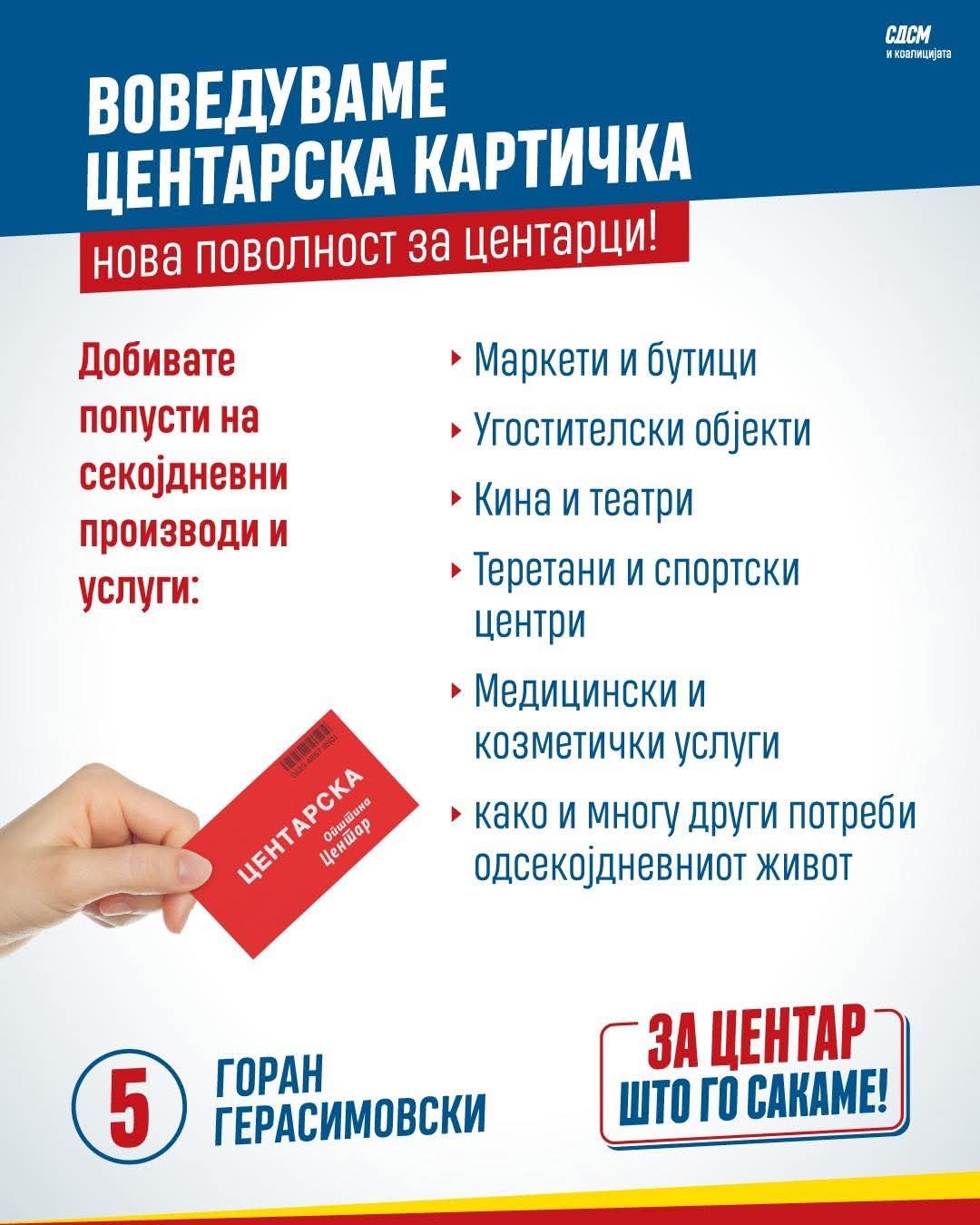 Кандидатот за градоначалник на Општина Центар од СДСМ, Горан Герасимовски, најави воведување на специјална „Центарска картичка“ која на граѓаните од општината ќе им овозможи низа поволности, попусти и придобивки.