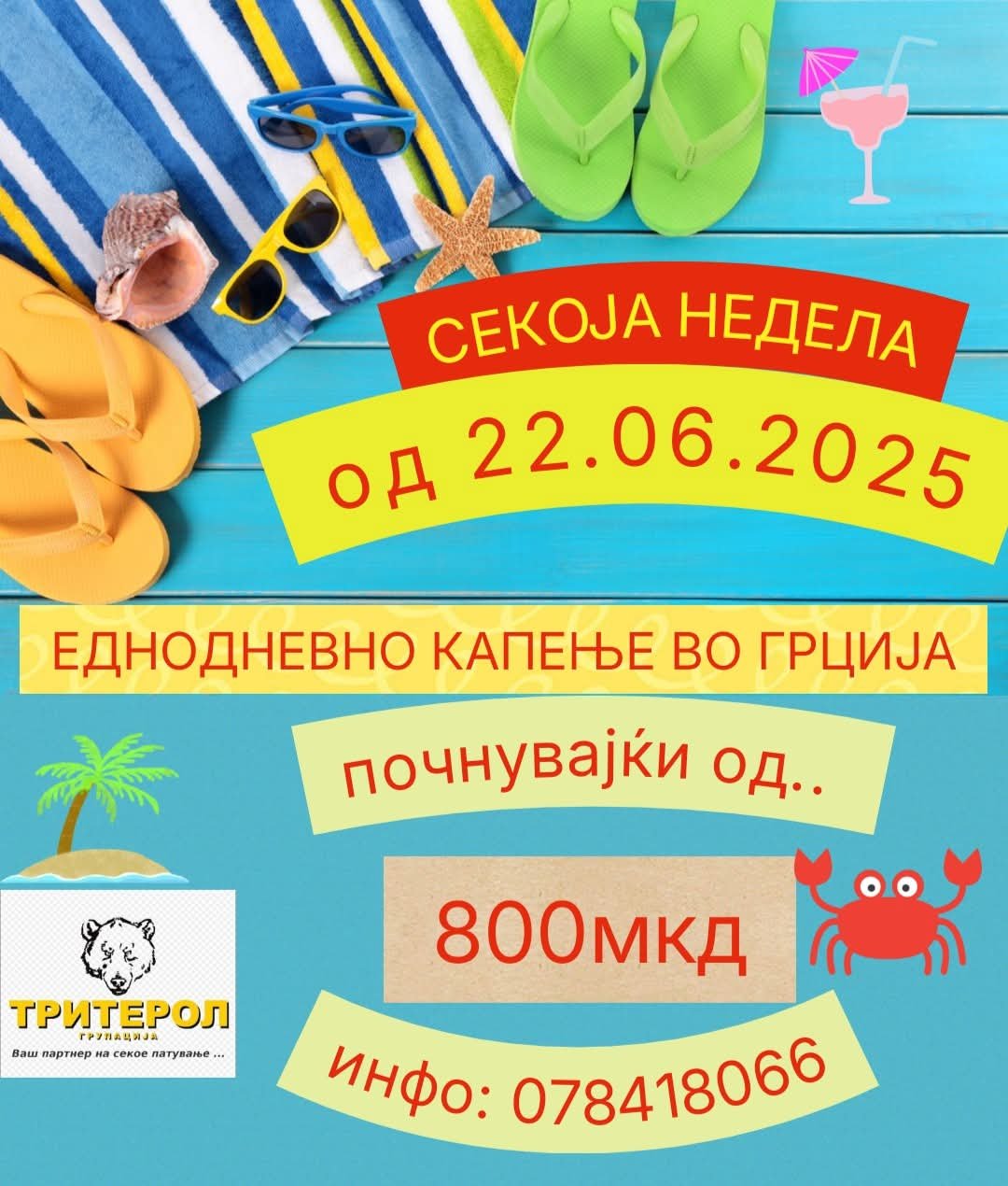 Почнувајќи од 22.06.2025 па до крајот на летото, секоја недела започнуваме со еднодневно капење на плажите во Грција.