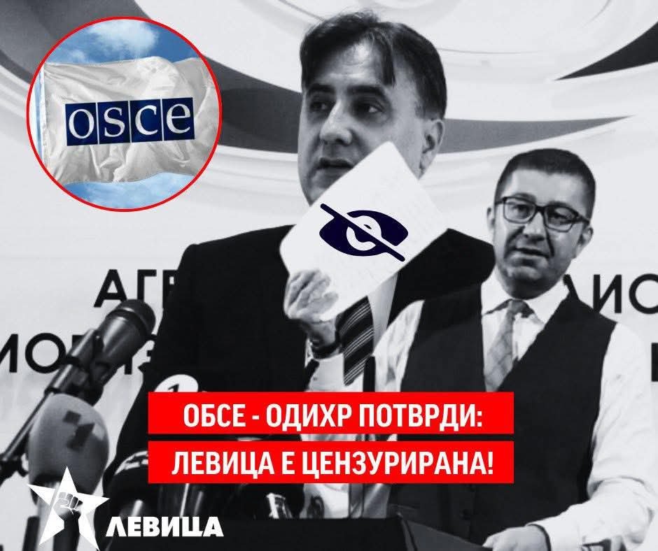Партијата Левица објави соопштение во кое наведува дека ОБСЕ (ОДИХР) во својот преоден извештај за локалните избори јасно нотира дека Левица е жртва на цензура во политичкото рекламирање.