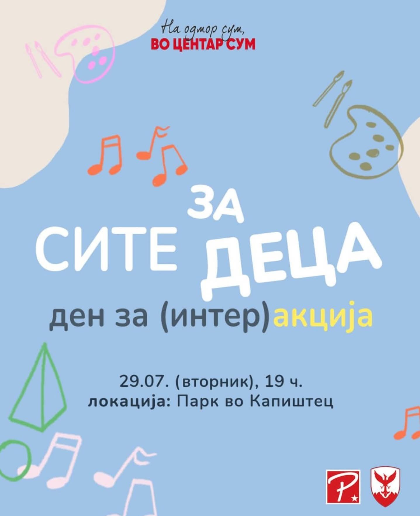 На 29 јули, паркот во Капиштец ќе биде преполн со детска смеа, радост и креативна енергија, благодарение на специјалниот настан организиран од Општина Центар. Под мотото „Ден за интер(акција), игра, создавање и насмевки“, градоначалникот Горан Герасимовски ги поканува сите деца и нивните родители на едно незаборавно попладне исполнето со забава.