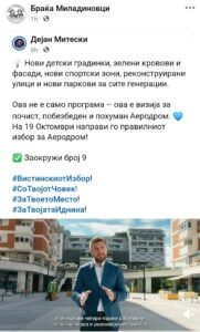 Општинската организација на СДСМ Аеродром остро реагира на, како што го нарекуваат, скандалозен чин во кој официјалниот профил на основното училиште „Браќа Миладиновци“ споделил видео-спот од политичка кампања за локалните избори. СДСМ го осудува овој потег како директно прекршување на законите и срамно партизирање на јавните институции.
