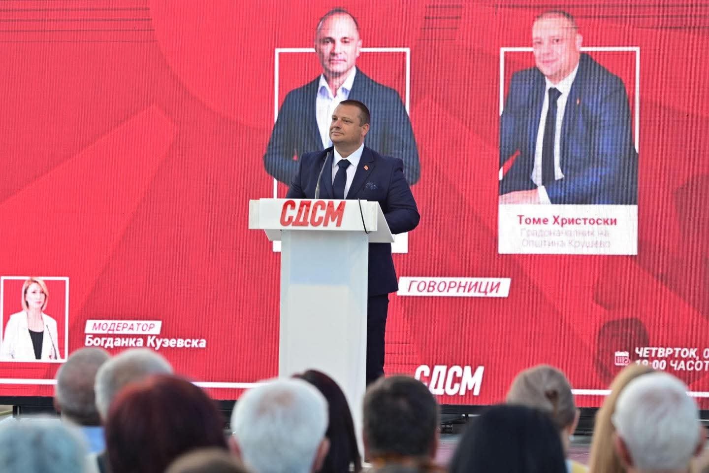 Со особена чест и голема одговорност денеска ви се обраќам од името на граѓаните на Крушево – градот на храброста, историјата и надежта. Градот симбол на слободата и непокорот. Денес сме тука, не само да зборуваме за политиката, туку да зборуваме за прогресот, визија и иднината што сите заедно ја градиме под знамето на Социјалдемократскиот сојуз на Македонија. СДСМ отсекогаш бил гласот на народот, заедништвото, двигател на реформи и симбол на напредокот. Денес не сме тука заедно без разлика на верска или било каква друга поделеност, само за да одбележиме уште еден момент во политичкиот календар, туку сме тука за да потврдиме дека веруваме во иднина – иднина на развој, правда, еднаквост, слобода и просперитет. Иднина која ја градиме заедно, со дело и посветеност, чекор по чекор, за секоја улица, за секое населено место, за својот град, за својата општина. Тука сме да го потврдиме нашето заедничко уверување – дека Македонија може повеќе, а Крушево уште повеќе. Дека со планско работење, труд и единство – и највисоките цели се достижни, истакна Хрискоски.